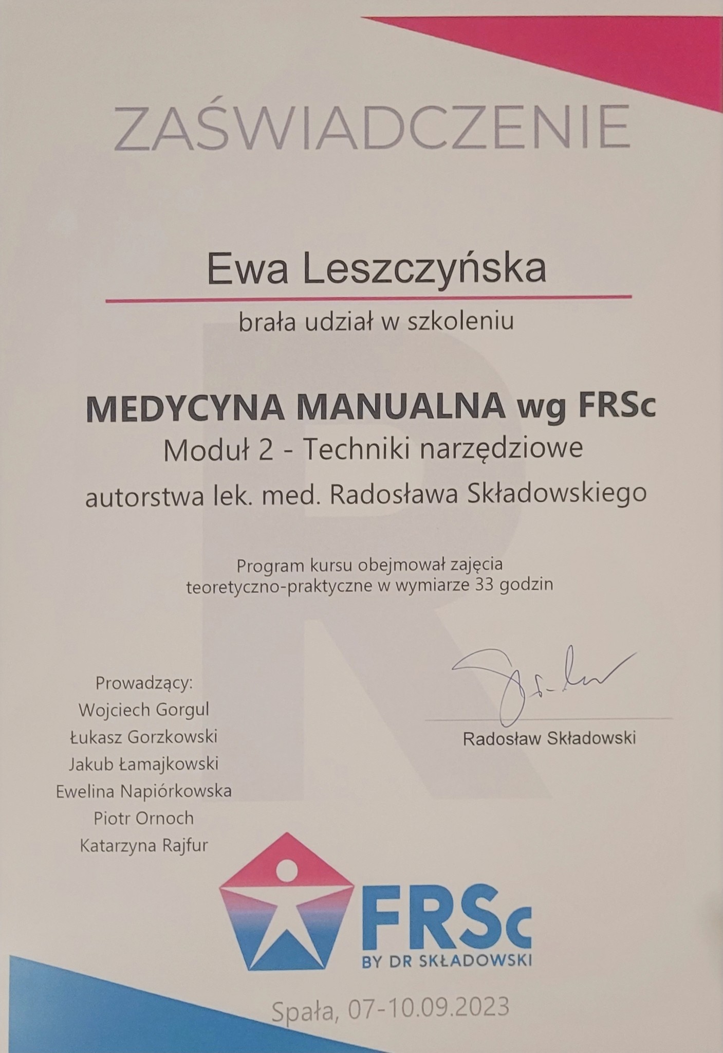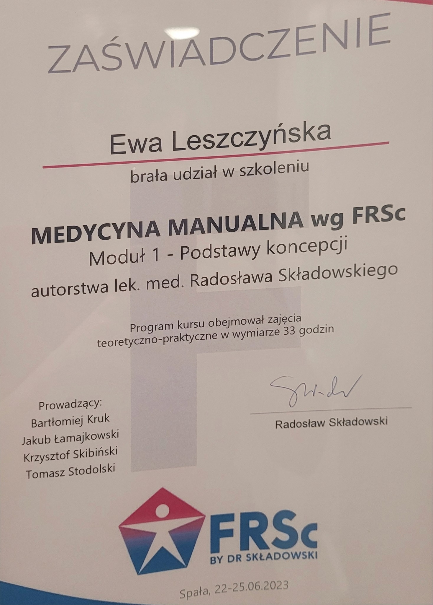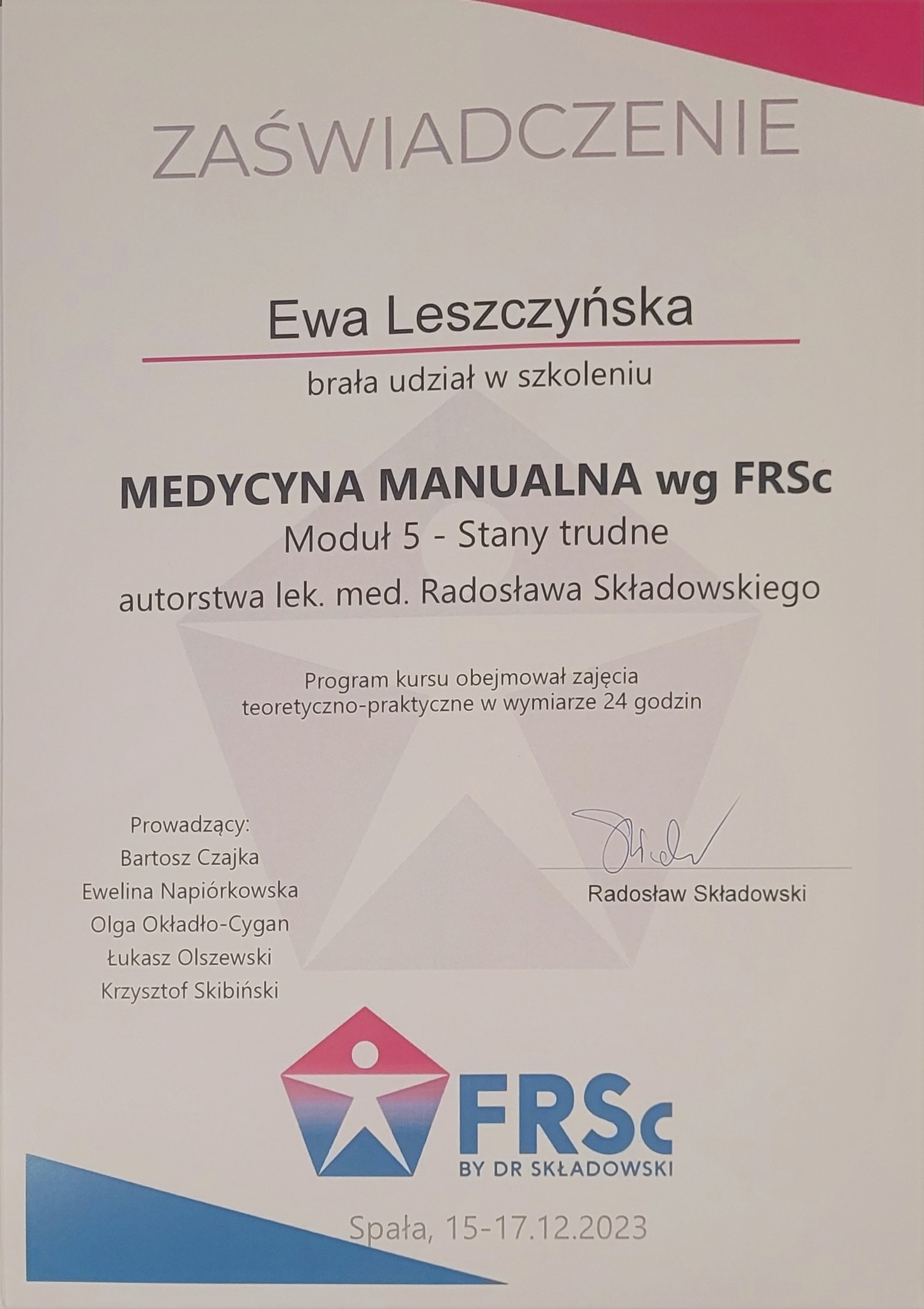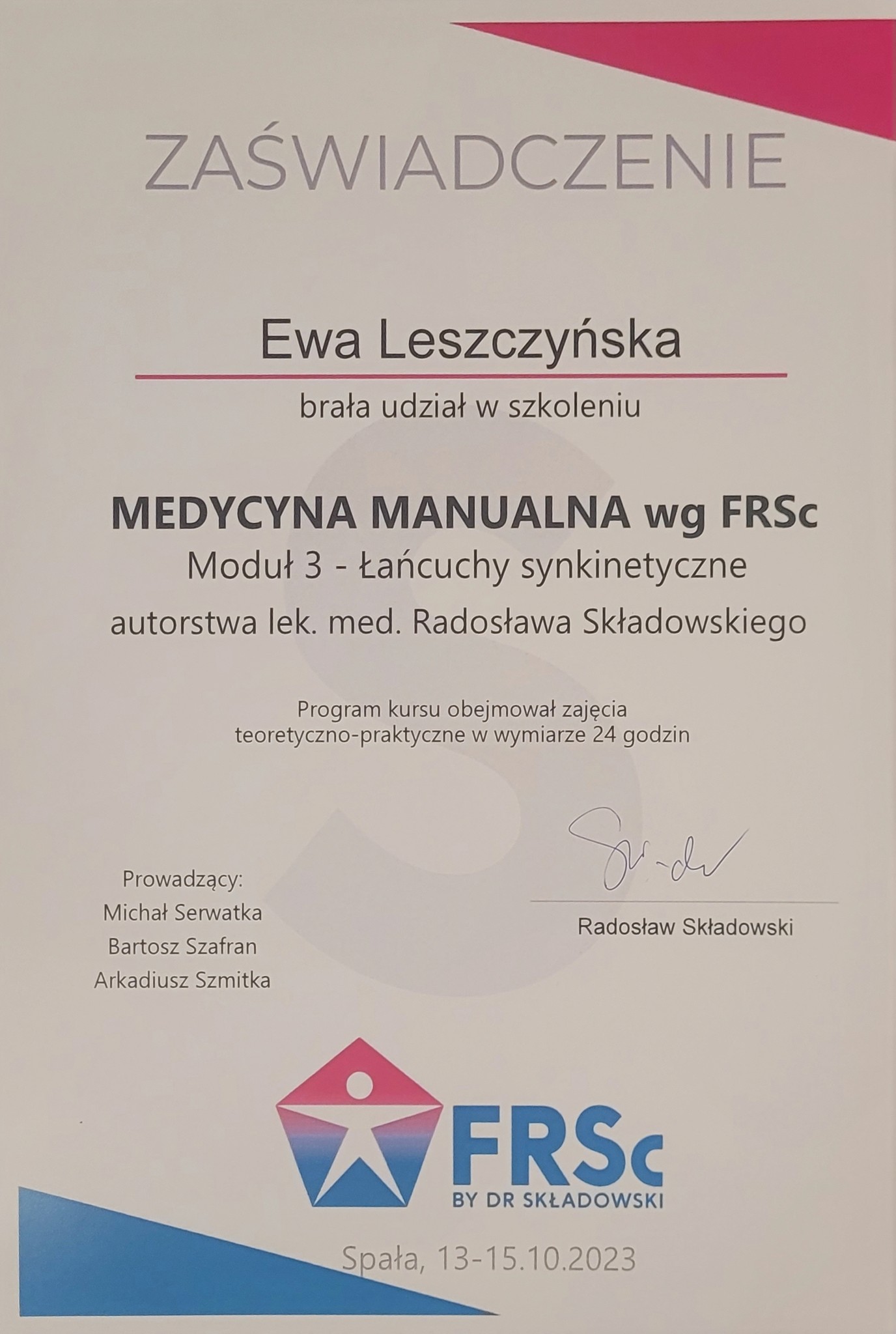 Łańcuchy synkinetyczne autorstwa lek. med. Radosława Składowskiego. Zajęcia teoretyczno- praktyczne w wymierze 33 godzin.
