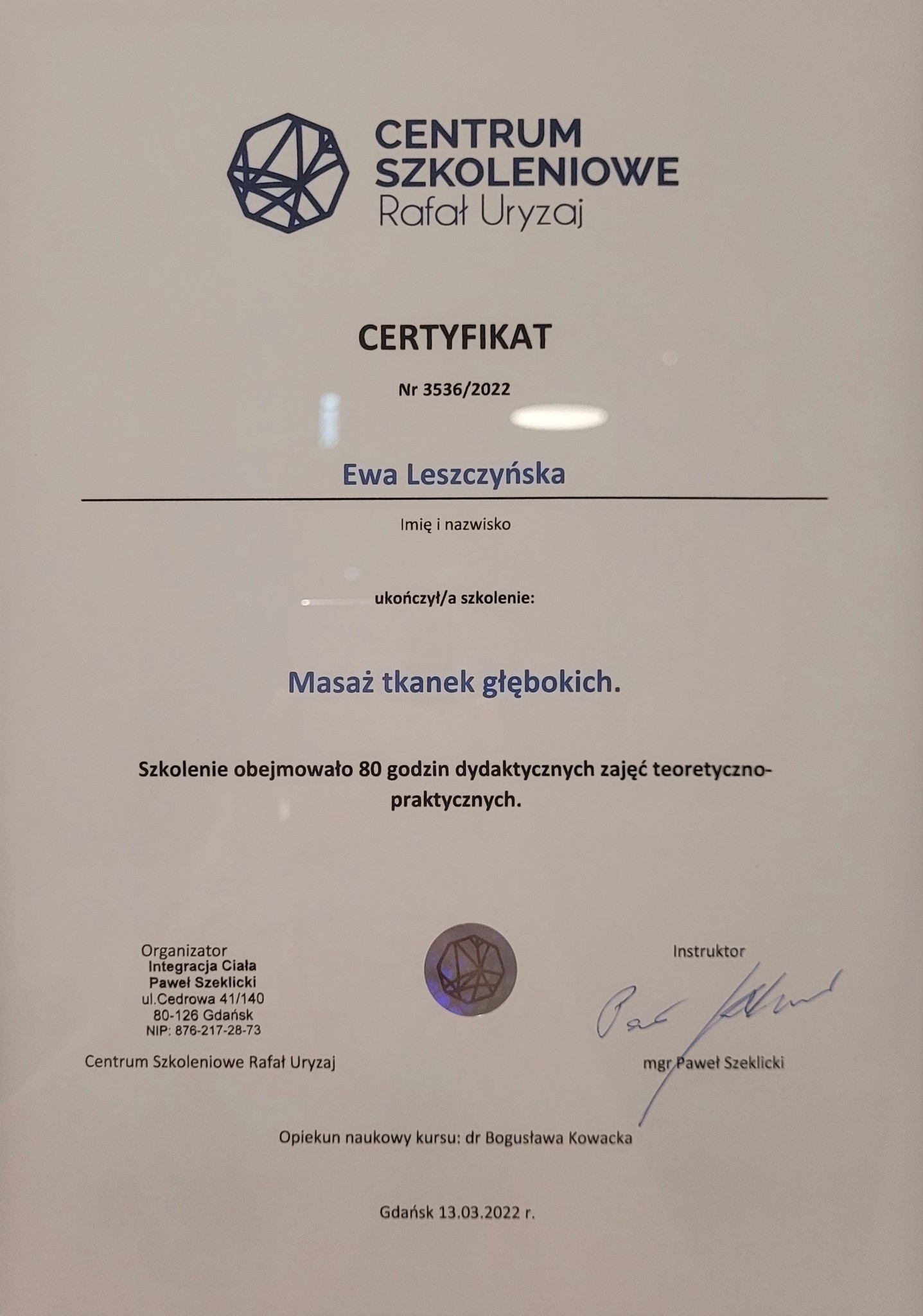 Masaż tkanek głębokich centum szkoleniowe Rafał Uryzaj. Szkolenie obejmowało 80 godzin zajęc troretyczno-praktycznych.