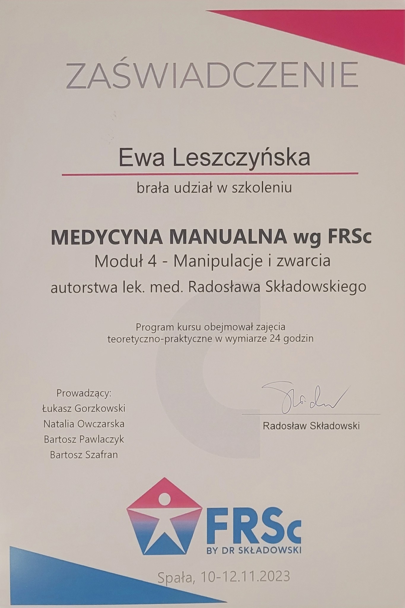 Manipulacje i zwarcia autorstwa lek. med. Radosława Składowskiego. Zajęcia teoretyczno- praktyczne w wymierze 24 godzin.